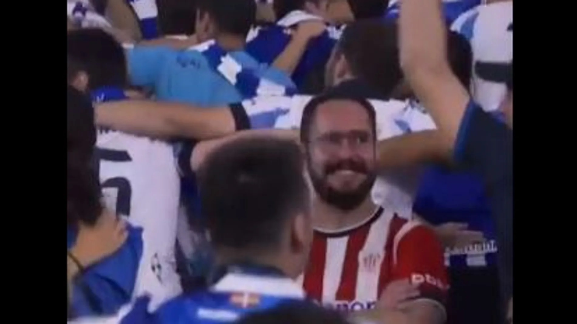 En pleno éxtasis de la afición local, los aficionados empezaron a bailar de espaldas y agarrados en todo el estadio. Fue entonces cuando las cámaras de televisión enfocaron a un hincha visitante que, entre una marea de camisetas azules y blancas, sonrió con su camiseta del Athletic pese a las circunstancias.