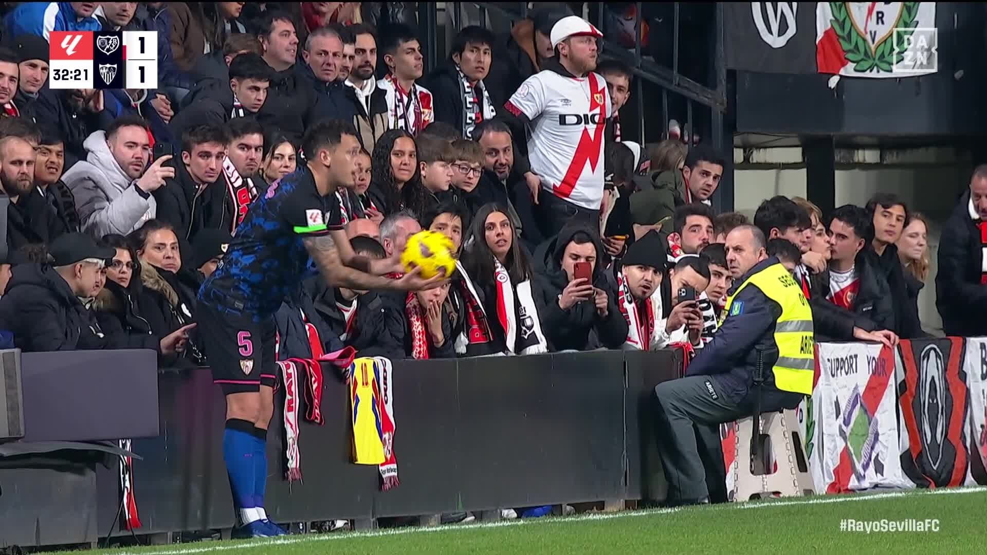 El conjunto hispalense se puso por delante con un tanto de En-Nesyri, pero muy pronto igualó Isi Palazón. Con 1-1 en el marcador se produjo la imagen más surrealista y lamentable de la temporada cuando un aficionado del Rayo tocó con su dedo el orificio del ano del extremo argentino del Sevilla Lucas Ocampos cuando procedía a sacar de banda.