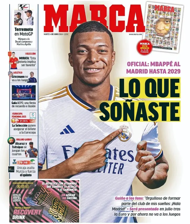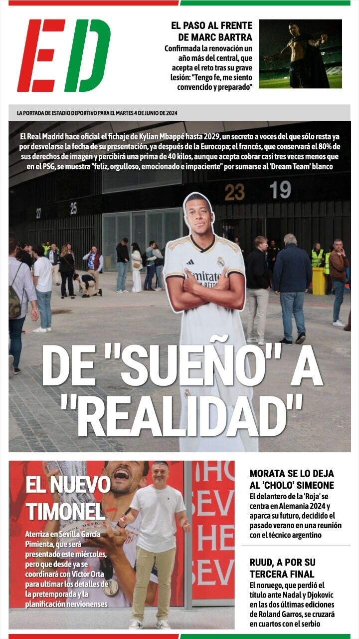 "El Madrid oficializa el fichaje del francés por cinco años". Además destaca unas declaraciones de Mbappé tras anunciar su fichaje: "Un sueño hecho realidad. Estoy impaciente por veros, madridistas".