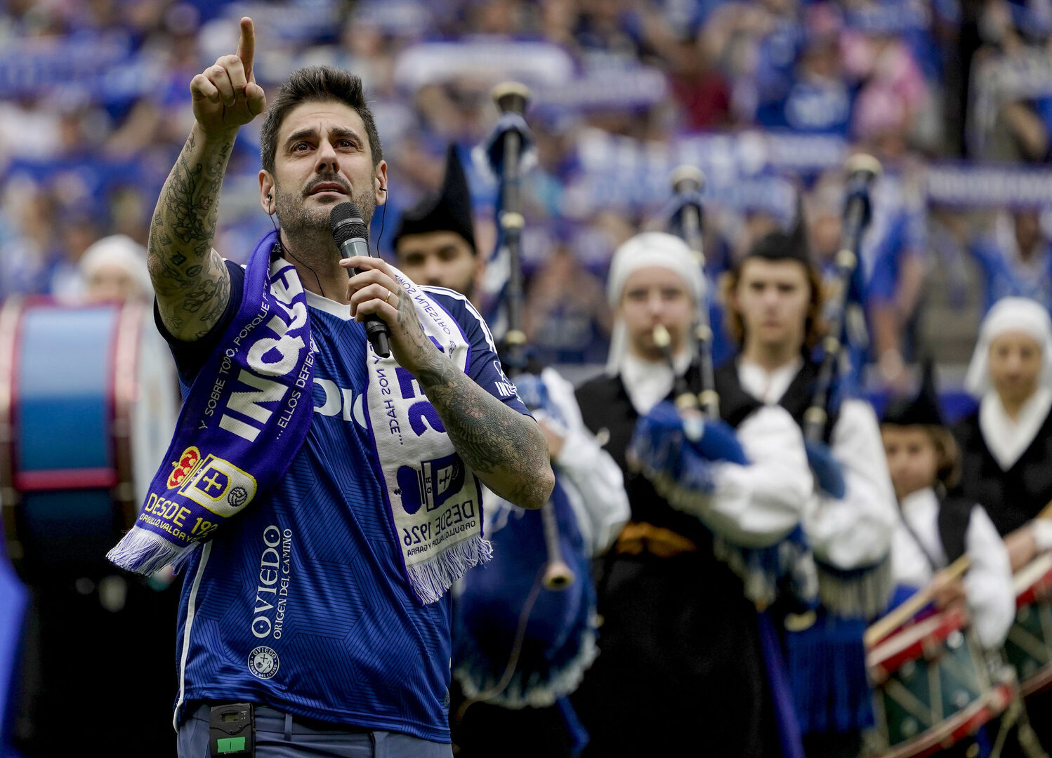 La previa del partido no pudo ser más emotiva en clave Real Oviedo, con un Carlos Tartiere lleno cantando a pleno pulmón el himno de Asturias primero y después, ya con Melendi sobre el césped del estadio, el 'Volveremos' que tan famoso se hizo en la capital del Principado hace ya más de diez años.