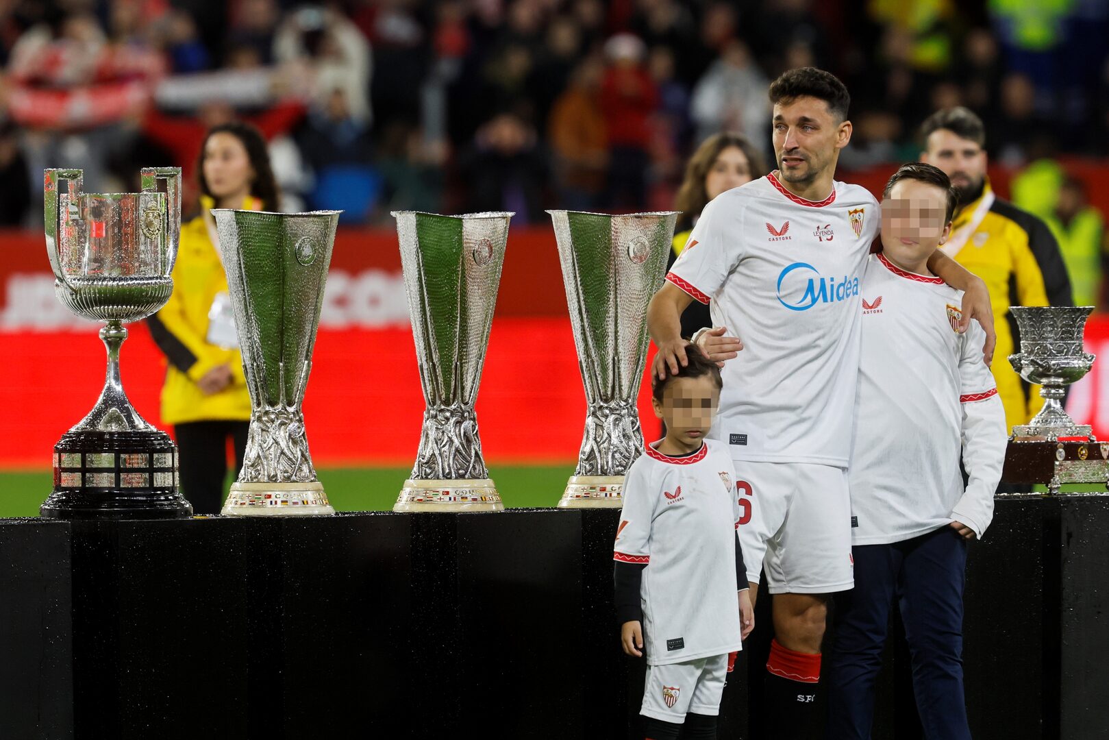 Tras saludar a sus padres y su esposa, el palaciego salió al campo con sus hijos visiblemente emocionado, con lágrimas compartidas por todo el sevillismo, cuando el jugador posó en el centro del campo ante los trofeos logrados en su carrera y con los vítores de "Navas, Navas, Navas..." de la afición.