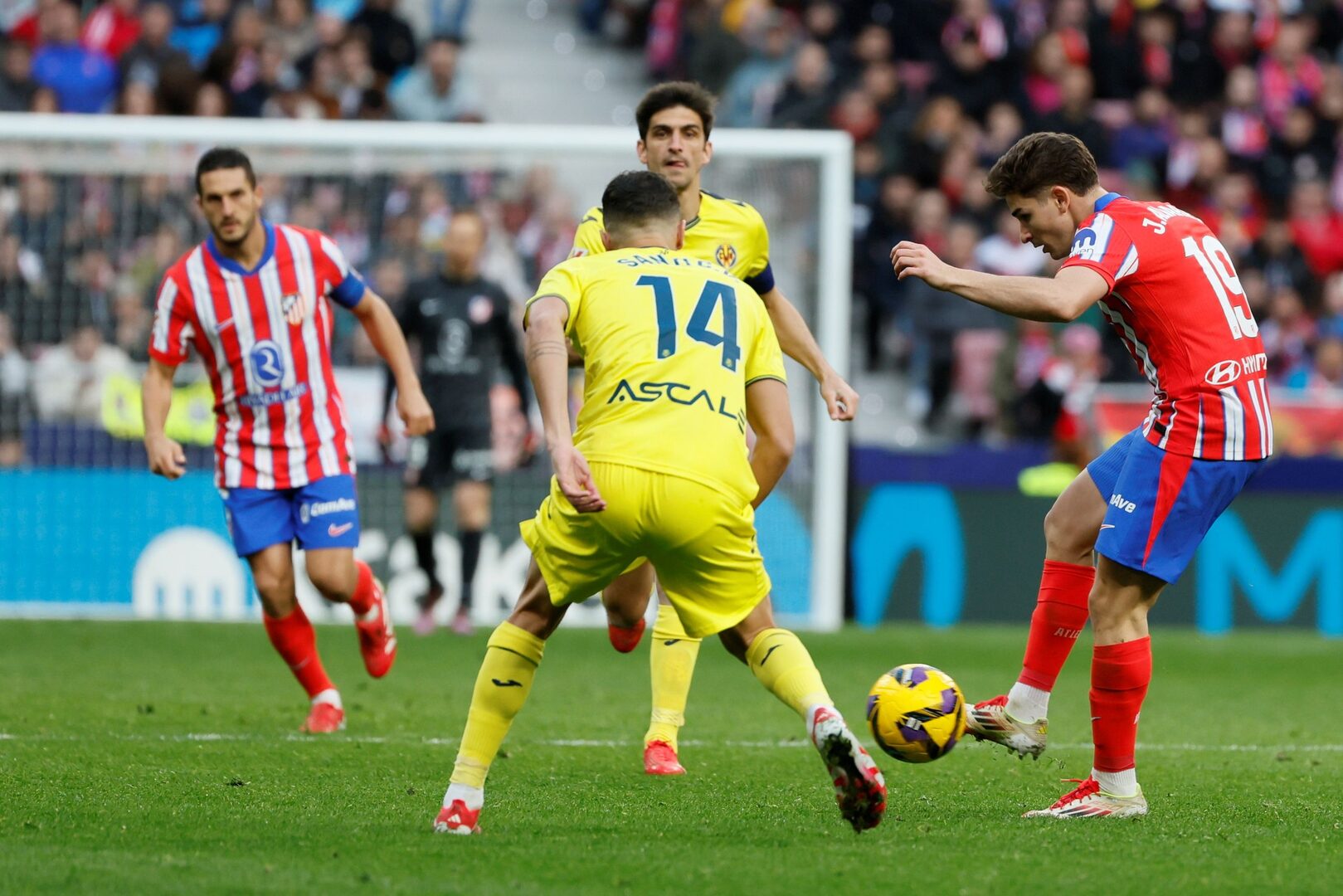 En el Metropolitano, cuatro días después de la vibrante remontada al Bayer Leverkusen en la Champions, el equipo colchonero salió animado y generó una doble ocasión entre tres de sus argentinos. Julián Álvarez picó un pase para Correa, que lo domó en el pico izquierdo del área hasta avanzar unos metros y centrar fuerte. Llegando en tromba intentó cabecear Giuliano Simeone, pero no dio a la bola y ésta siguió viva hasta caer de nuevo en botas de la Araña Álvarez; su disparo desde lejos con la zurda fue bien atrapado por el guardameta rival, Luiz Júnior. Solo tres minutos se habían consumido en el reloj y el Villarreal ya estaba achicando aguas en defensa.