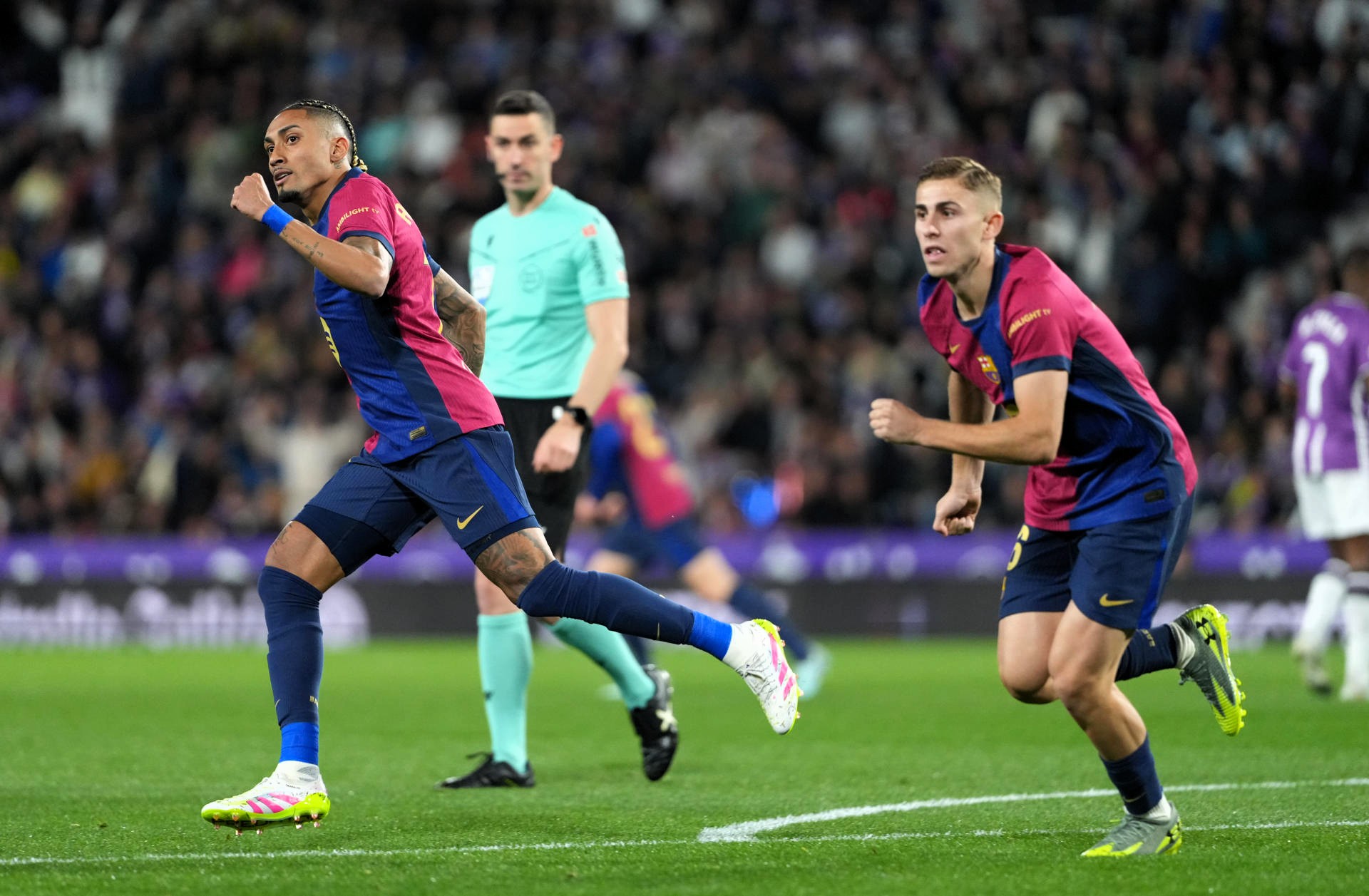 Remontada que sabe a título de Liga. El FC Barcelona ha sabido voltear el 1-0 que el Real Valladolid, colista y ya descendido matemáticamente a Segunda División, consiguió muy pronto y con el que se llegó al descanso, tras la diana de Iván Sánchez en el 6’. Sin embargo, gracias a los goles de Raphinha y Fermín López en apenas siete minutos —los que fueron del 53 al 60—, el conjunto de Hansi Flick ha sumado los tres puntos en el José Zorrilla (1-2) para dar un paso de gigante hacia el campeonato.