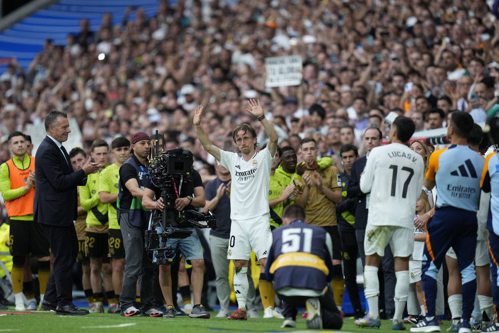Poco fútbol y mucha emoción en el Santiago Bernabéu en la última jornada de Liga. Sin nada en juego, el balón pasó a un segundo plano, en el día en el que dos leyendas como Modric y Ancelotti, jugador y entrenador más laureados de la historia del club, se despedían del feudo madridista. Dos grandes tifos que rezaban 'Gracias, Leyenda', y 'Gracias, Carletto' recibieron al equipo en la previa de un partido que se rompió con el cambio del croata ante un estadio en pie.