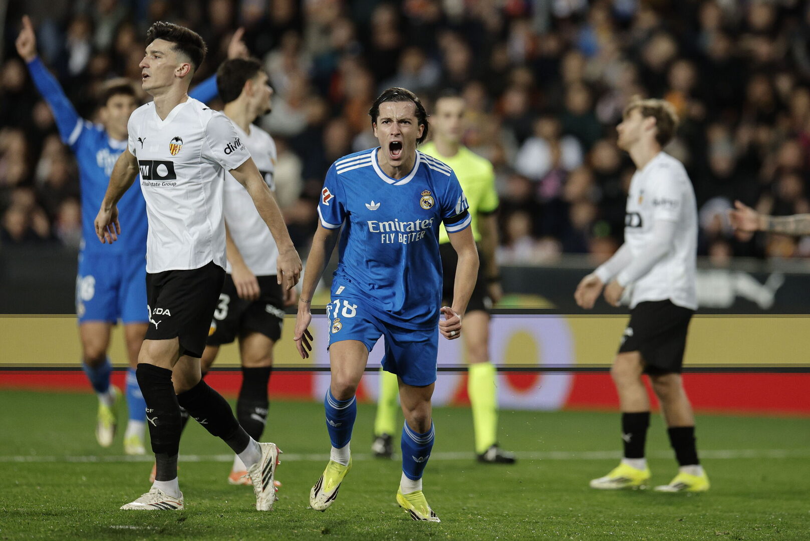 Conforme avanzaba el partido y el Valencia llegaba más al área de Courtois, Mestalla se enganchaba mientras que el equipo blanco, pese a tener más balón, no proponía gran cosa. En los primeros quince minutos, apenas llegaron balones a Mbappé y Gonzalo. Pero, pasado el primer cuarto de hora, el Madrid comenzó a enchufarse.