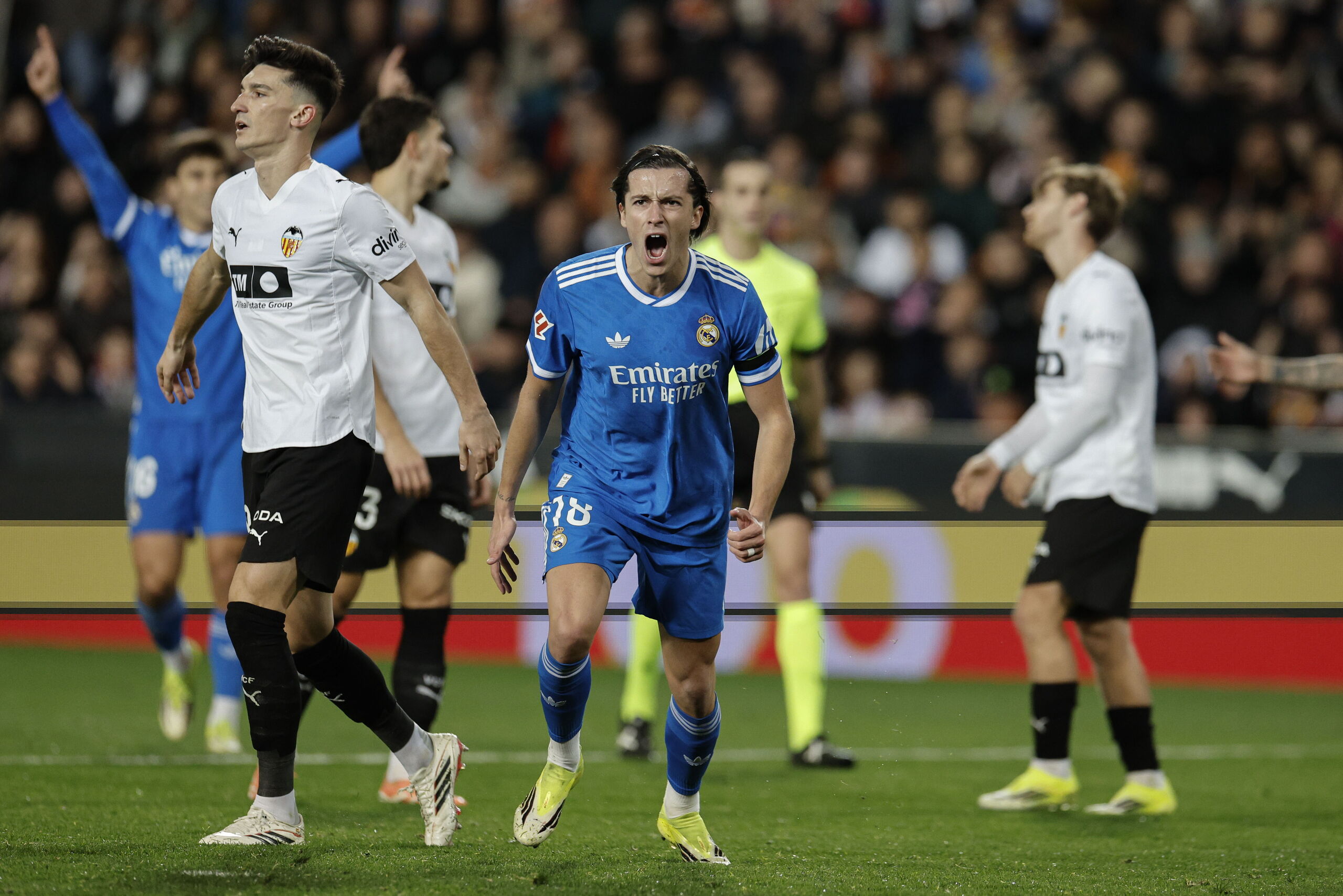 El Valencia, muy concentrado en tapar a Mbappé en cada acción, se mantuvo bien en defensa para conceder las mínimas ocasiones al equipo madrileño, que solo aparecía cuando Güler encontraba al francés y cuando el turco jugaba cerca del área.