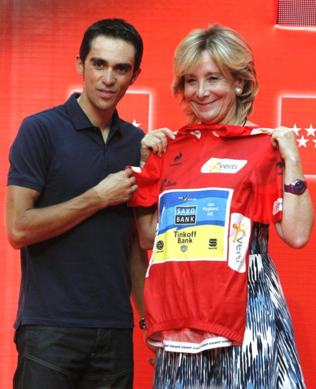 Esperanza Aguirre ha recordado los duros tiempos que Contador tuvo que superar tras ser suspendido por dopaje: "Me da mucha alegría que estés aquí por los tiempos tan difíciles que has pasado. Cada vez que vienes te digo que volverás, y tú siempre vuelves. Tu fuerza y capacidad de sacrificio es insuperable". Y quiso poner en relieve el ejemplo que han dado para el deporte los tres ciclistas que coparon el podio: "Hay que destacar la capacidad de sacrificio y la humildad que habéis tenido antes, durante y después de cada etapa, y eso nos enorgullece a los españoles".