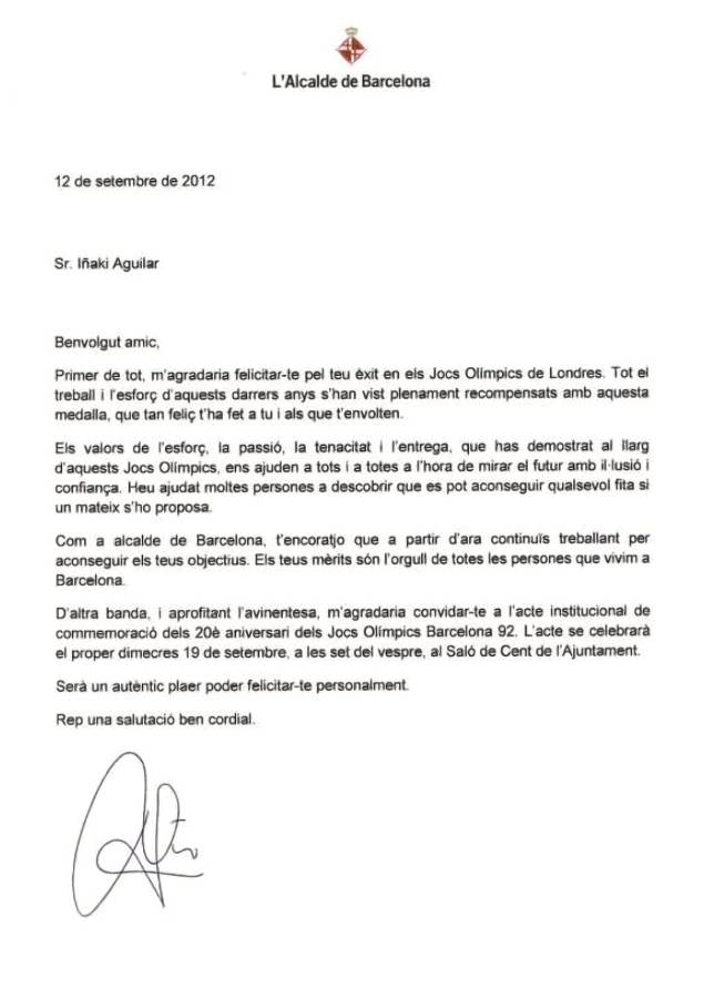 Así lo ha desvelado en su cuenta de Twitter el portero internacional Iñaki Aguilar, que ha colgado el documento en el que el alcalde le felicita por el esfuerzo y "la medalla". "Primero de todo, me gustaría felicitarte por tu éxito en los Juegos Olímpicos de Londres. Todo el trabajo y el esfuerzo de estos últimos años se ha visto plenamente recompensado con esta medalla, que tan feliz te ha hecho a ti y a los que te rodean", dice la misiva enviada por el alcalde.