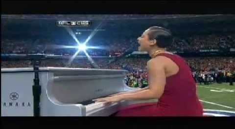 Alicia Keys salió al escenario del SuperDome de Nueva Orleans, tras el coro de Sandy Hook y Jennifer Hudson, para interpretar el himno nacional de Estados Unidos. La cantante neoyorquina se sentó al piano con un sexy vestido rojo de tirantes.