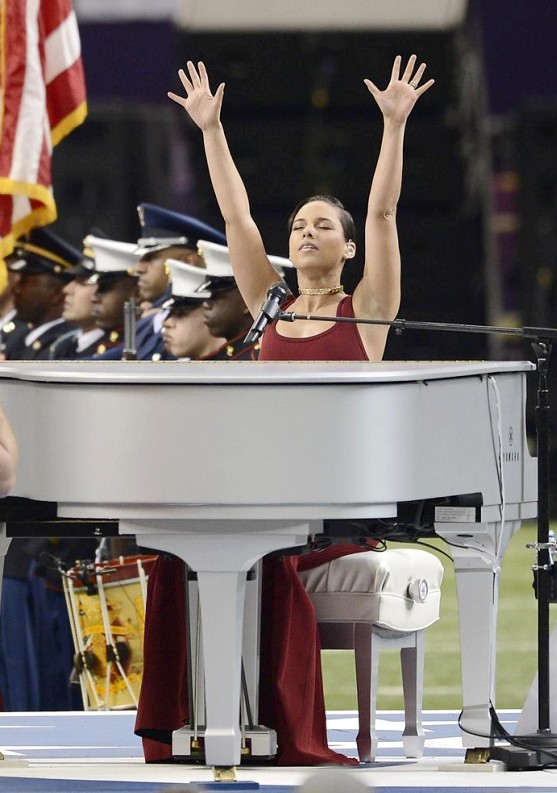 Alicia Keys salió al escenario del SuperDome de Nueva Orleans, tras el coro de Sandy Hook y Jennifer Hudson, para interpretar el himno nacional de Estados Unidos. La cantante neoyorquina se sentó al piano con un sexy vestido rojo de tirantes.