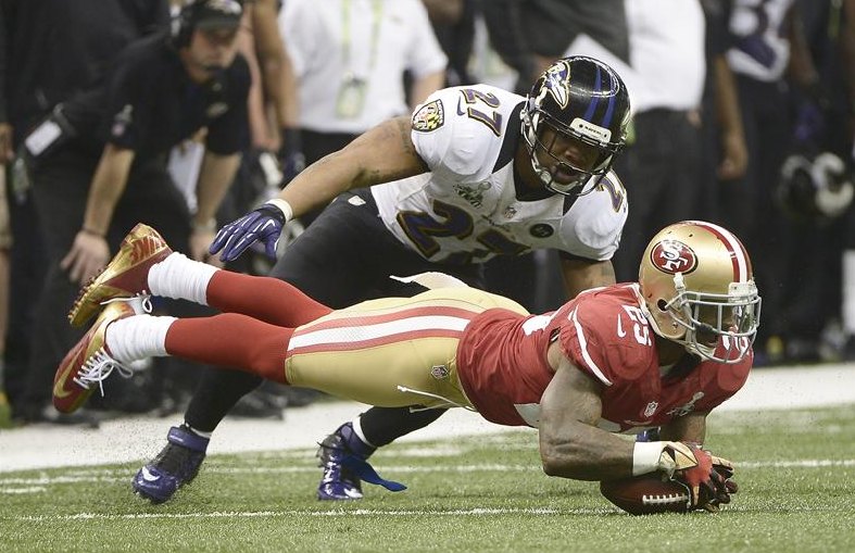 Ray Rice, de los Ravens, realiza un placaje sobre Tarell Brown.