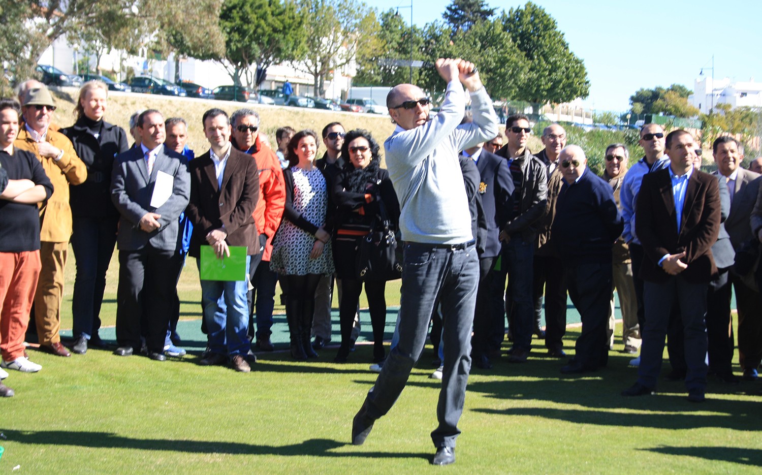 La escuela de Golf Miguel Ángel Jiménez se ha inaugurado con la presencia del jugador profesional, apoyado en sus dos muletas, en plena fase de recuperación de la rotura de tibia sufrida en Sierra Nevada y que le mantiene apartado de los campos de golf.