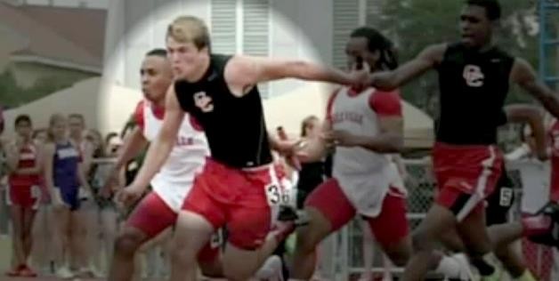 La historia sucedió en un campeonato de escuelas secundarias de Texas. En la prueba de 4x100 el Columbus High School Mighty Cardinals, el equipo en el que corría Derrick Hayes, iba ganando. Éste tomó el último relevo y, cuando se disponía a cruzar la meta como vencedor decidió levantar los dedos al cielo para dedicarle la victoria a Dios.