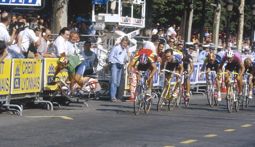 Djamolidine Abdoujaparov, el Terror de Tashkent. El corredor uzbeko nunca acabó entre los diez primeros en la general del Tour, Giro o Vuelta a España, pero cazaba etapas como churros, haciéndose con el maillot verde de la regularidad en tres ocasiones (1991, 1993 y 1994). Famoso por su agresivo estilo de esprintar y por mover excesivamente su bicicleta, Abdoujaparov, El Califa, se ganó unos cuantos enemigos en el pelotón y más de una caída, como la que sufrió en los Campos Elíseos en el 91.