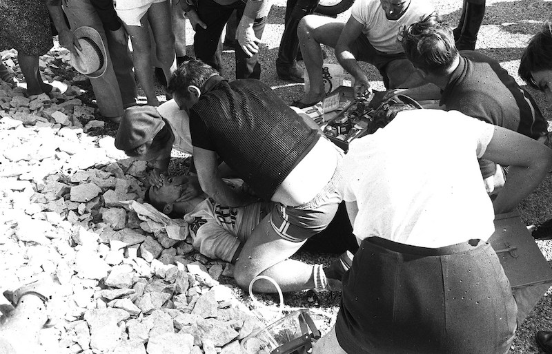 13 de julio de 1967. Decimotercera etapa con 211 kilómetros entre Marsella y Carpentras. El sol pegaba durísimo en Mont Ventoux, la montaña pelada de la Provenza, en una etapa infernal. Tom Simpson había perdido mucho tiempo en la general –estaba séptimo a 8:20 del líder Pingeon– al verse afectado por una severa infección estomacal. Pero decidió echar el resto. Y en la subida al monte calvo llegó la fatalidad. El ciclista británico del equipo Peugeot intentó el demarraje, pero enseguida se vio superado por el que sería el ganador en la cima, Julio Jiménez, pese a que la victoria de etapa fue para Jan Janssen. Simpson empezaba a cabecear de lado a lado hasta que cayó en la carretera. "Put me back on the bloody bike! (¡subidme a la maldita bici!)", le gritó a los miembros de su equipo el inglés, que aún logró aguantar algo más. Sólo 500 metros. Fue entonces cuando Simpson se desplomaba y moría en el acto. Según se supo después, la causa del fallecimiento fue una insuficiencia cardíaca ocasionada probablemente por una mezcla de anfetaminas (se le encontraron tres botes en el bolsillo de su maillot, uno de ellos vacío) y alcohol (algunos competidores le observaron beber brandy al comienzo de la etapa) que le ocasionaron una fuerte deshidratación. Se escribía así la página más negra en la historia del Tour de Francia.