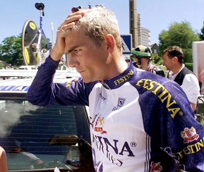 El de hace quince años fue el Tour de Francia más convulso de la historia. El 8 de julio, sólo unos días antes de que el pelotón tomara la salida en Dublín, el control de aduanas entre Bélgica y Francia en Neuville-en-Ferrain interceptó al masajista del equipo Festina, Willy Voet, que se dirigía a la salida con doscientas ampollas de EPO, casi cien de hormonas de crecimiento y docenas de cajas de testosterona. Junto a él y los directores, médicos y corredores del Festina –entre ellos el francés Richard Virenque–, cayeron miembros de los conjuntos TVM, ONCE-Deutsche Bank, Big Mat, Casino y Lotto. Ante los registros y detenciones que se extendieron a prácticamente todas las formaciones, la organización decidió expulsar a varios equipos, entre ellas los españoles Banesto, Kelme, Vitalicio Seguros y ONCE. El director de este último conjunto, Manolo Saiz, dijo con la franqueza que le caracteriza: "Le hemos metido el dedito por el culo al Tour de Francia".