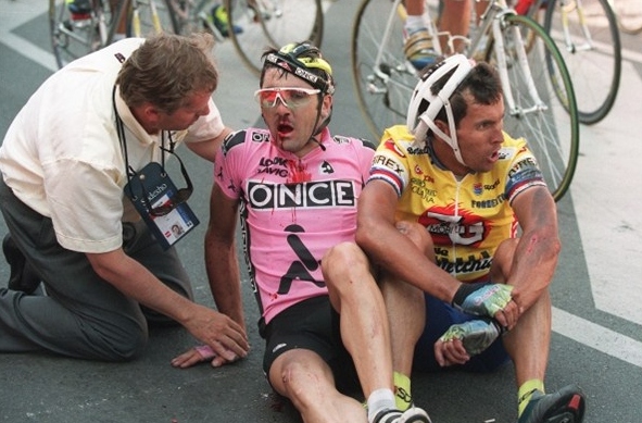 En 1994, el Tour estaba aún en pañales cuando Laurent Jalabert, uno de los grandes favoritos, quedaba fuera de combate a las primeras de cambio. En la primera etapa, con final en Armentieres, a un gendarme incauto no se le ocurrió otra cosa que asomar el cuerpo para hacer una foto del sprint. Fue arrollado por Abdoujaparov y Wilfried Nelissen. Este corredor belga y Jalabert fueron los peor parados. Especialmente el francés, que dio varias vueltas de campana, sufriendo una espeluznante caída a más de 60 por hora y perdiendo casi toda la dentadura. La imagen de la sangre manando a borbotones por el rostro de Jaja dio la vuelta al mundo.