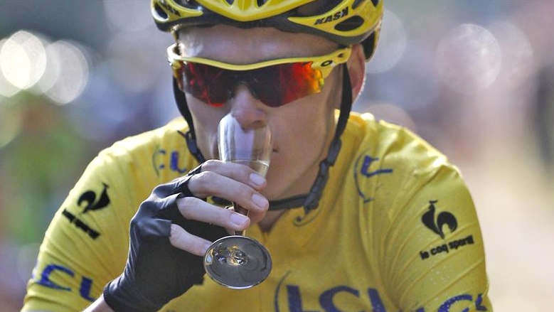 Nada más darse la salida en el Palacio de Versalles, y siguiendo con la tradición, Chris Froome se tomó una copita de champán para celebrar su victoria en la Grande Boucle.