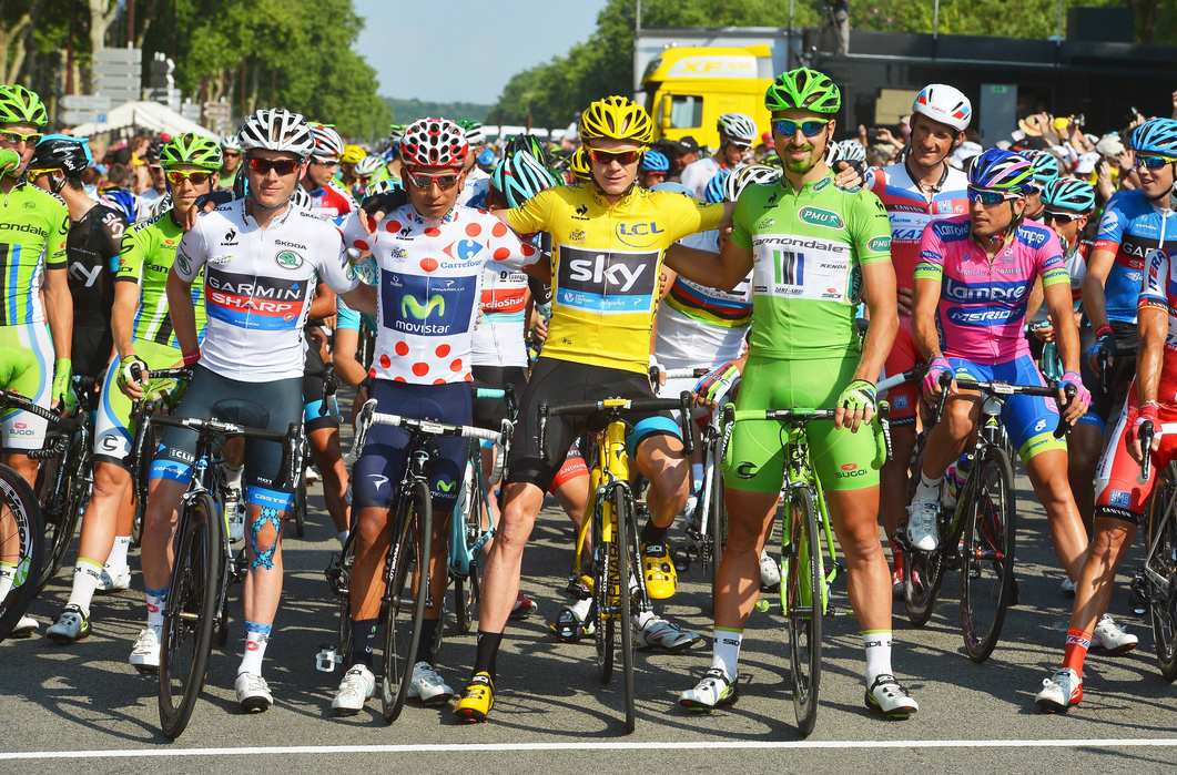 Chris Froome posa con los ganadores del resto de clasificaciones: el estadounidense Andrew Talansky (maillot blanco al mejor joven), el colombiano Nairo Quintana (maillot de lunares al rey de la montaña) y el eslovaco Peter Sagan (maillot verde de la regularidad).