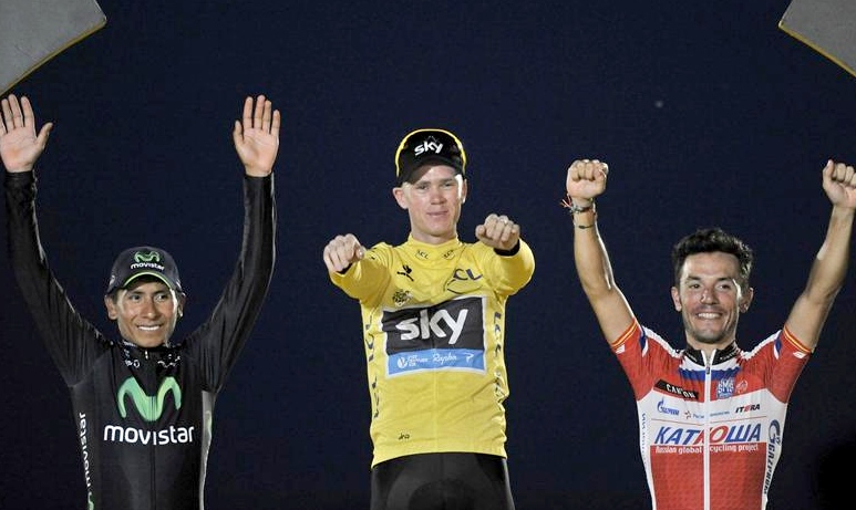 Froome compartió podio con el colombiano Nairo Quintana (i), segundo clasificado, y el español Joaquim 'Purito' Rodríguez (d).