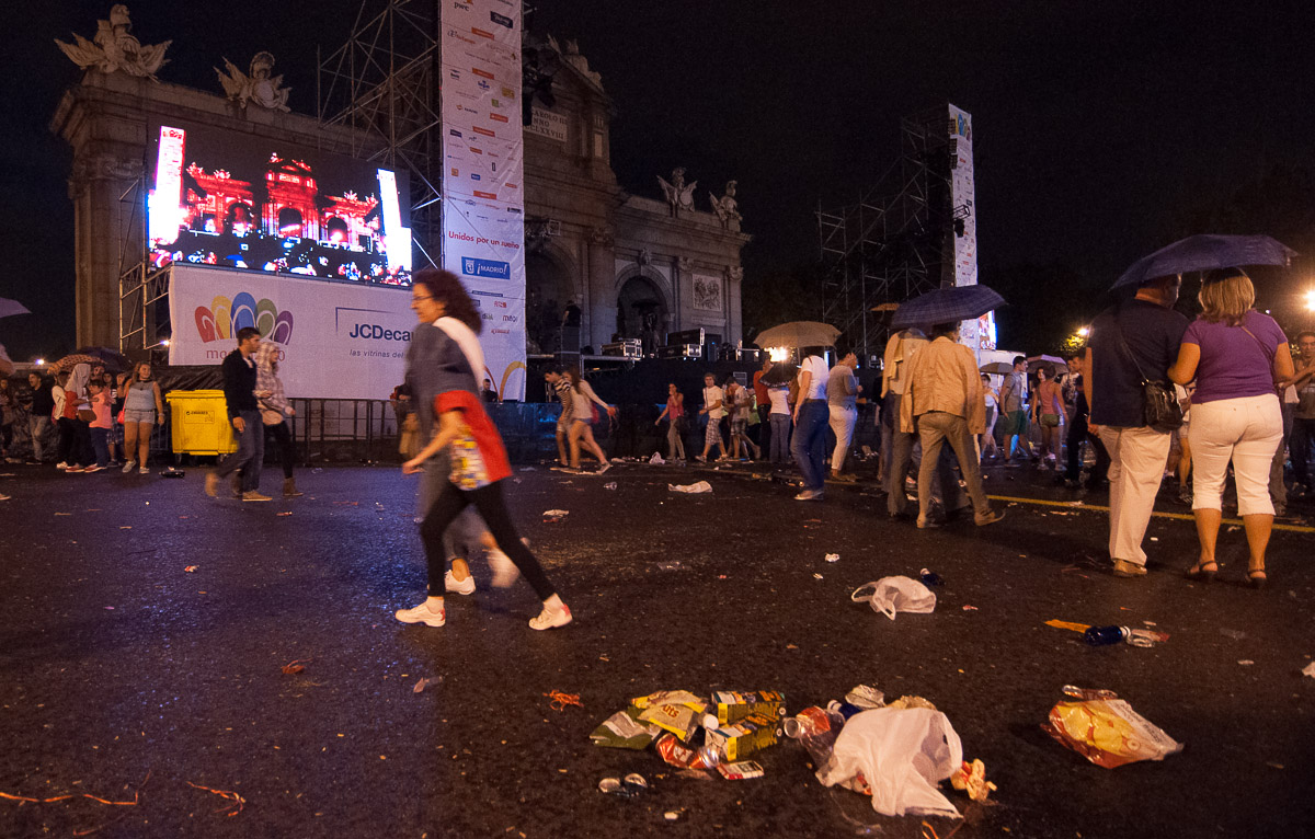 Poca gente, lluvia y restos de la fiesta, una buena imagen de la decepción que llenó la Puerta de Alcalá y alrededores