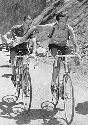 El duelo llegó más allá del ciclismo. En realidad, fue más una rivalidad creada por el pueblo y la prensa que por ellos mismos. El país estaba dividido en los Bartalistas y los Coppistas. Un antagonismo que se terminó durante una etapa en el Tour del 52. Allí, mientras iban los dos escapados en busca de la victoria final, Bartali le dio de beber de su botella de agua a un exhausto Coppi; o Coppi le dio de beber de su botella a un exhausto Bartali. En realidad, nunca se sabrá. Pero esa imagen quedó para la posteridad de la historia del deporte, y terminó de un plumazo con un duelo legendario, en la carretera y fuera de ella.