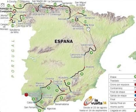 La Vuelta saldrá de Jerez de la Frontera el 23 de agosto con una contrarreloj por equipos de 12,6 kilómetros que vestirá de rojo al primer líder, y no finalizará en Madrid, sino en Santiago de Compostela, el 14 de septiembre, con otra cronometrada de 10 kilómetros que no se prestará a grandes sorpresas.