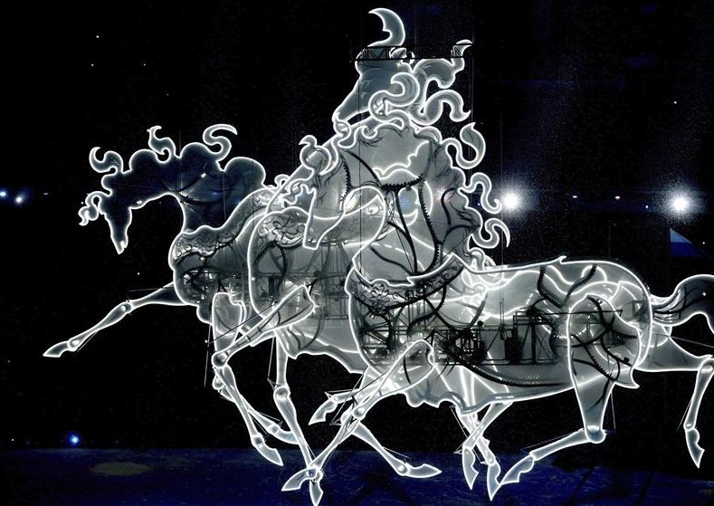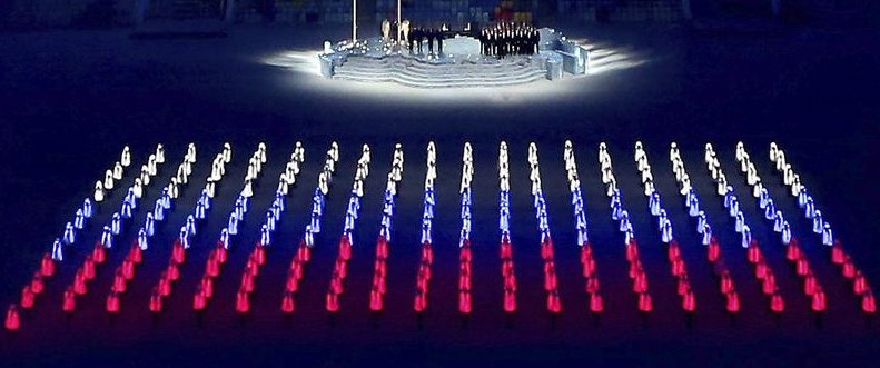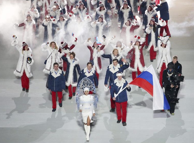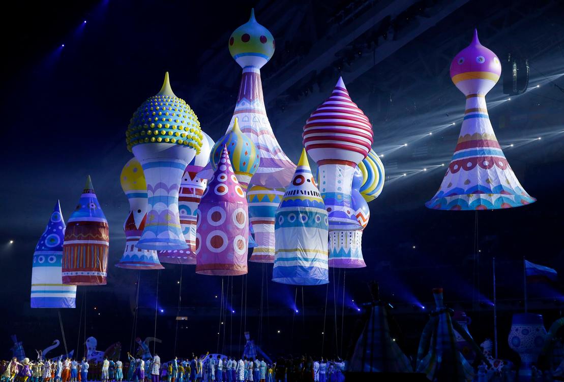 El bello himno nacional ruso sonó en el Estadio Olímpico de Sochi mientras un grupo de actores formó la bandera del país en el vasto escenario.