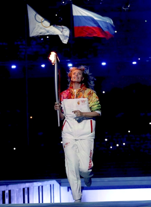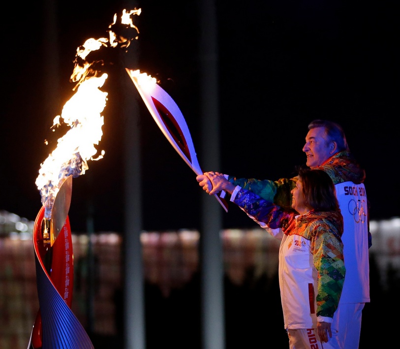 Dos leyendas del deporte ruso, el portero de hockey sobre hielo Vladislav Tretiak y la patinadora Irina Rodnina, tuvieron el honor de encender el pebetero en el Estadio Olímpico de Sochi.