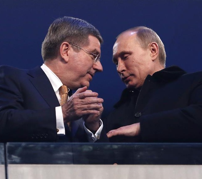 El presidente de la Federación de Rusia (d), Vladimir Putin, y el del Comité Olímpico Internacional, Thomas Bach, durante un momento de la ceremonia de inauguración.