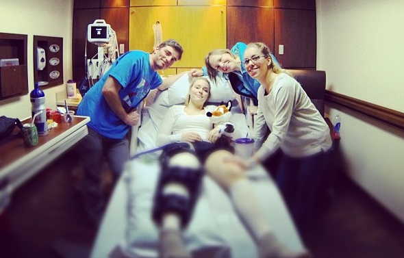 La esquiadora compartió esta foto en las redes sociales nada más operarse. Sufrido una rotura completa del ligamento colateral medio (MCL) y del ligamento cruzado anterior (ACL) en su rodilla derecha.