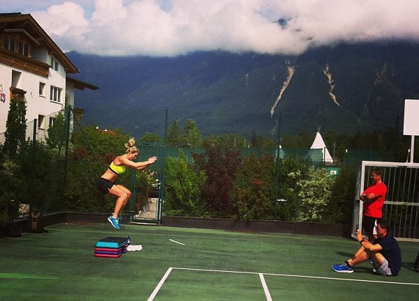 Esta imagen se capturó en Austria, cerca del lugar donde Lindsey se rompió la rodilla por primera vez. La esquiadora completó toda serie de ejercicios para regresar en las mejores condiciones posibles. Aquí está junto a varios entrenadores, después de completar un partido de tenis.