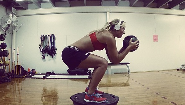 La esquiadora fortalece su maltrecha rodilla con varios ejercicios en el gimansio. Es la postura habitual en el descenso.