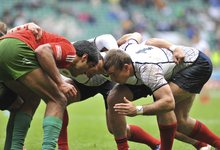 Una melé de tres jugadores en un partido de rugby a 7 | Cordon Press
