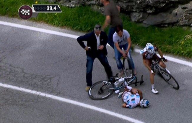 El ciclista italiano Domenico Pozzovivo sufrió este lunes una grave caída durante la bajada del puerto de Barbagelata, a 38 kilómetros de la meta, durante la tercera etapa del 98º campeonato del Giro de Italia.