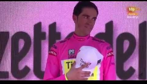 Mikel Landa no se quita la gorra mientras suena el himno de España