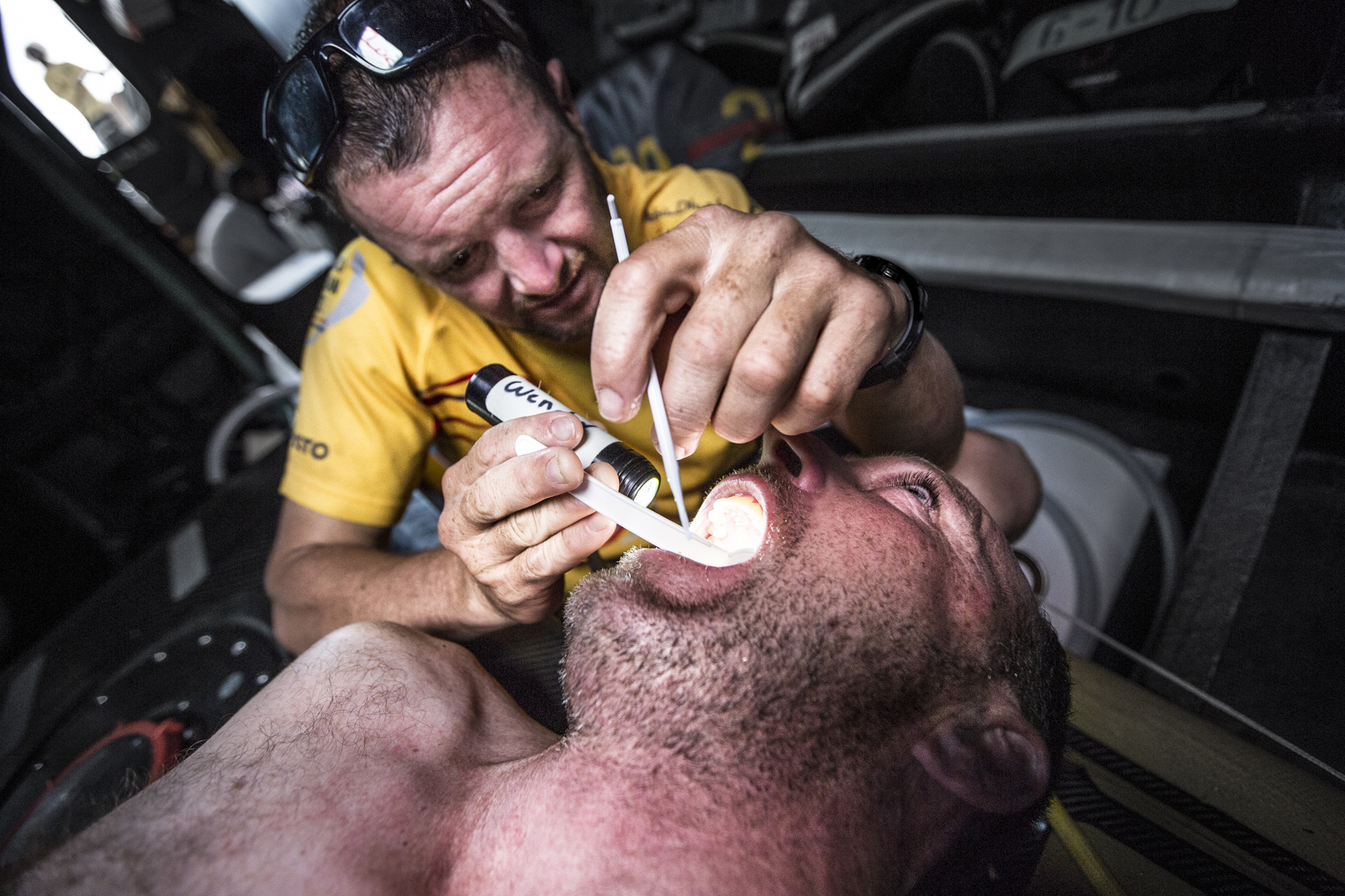 Wendy Harmer, tripulante del Abu Dhabi Ocean Racing entrenado como paramédico, intenta tratar una caries de uno de sus compañeros, en las precarias condiciones que se dan en un barco en medio del océano. Sucedió durante la etapa 2, entre Ciudad del Cabo (Sudáfrica) y Abu Dhabi, de 11.343 kilómetros.