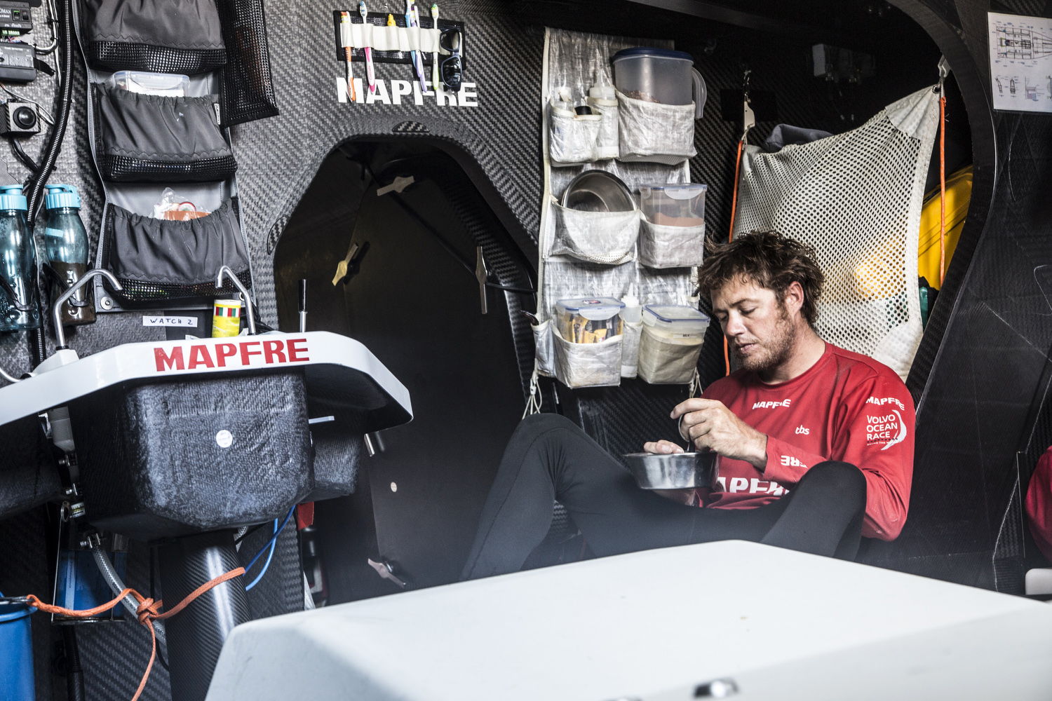Antonio 'Ñeti' Cuervas-Mons, proa del barco español MAPFRE, recupera fuerzas al acabar su guardia. Los tripulantes intentan trabajar en cubierta cuatro horas y descansar otras cuatro, lo que muchas veces no es posible. Ingieren comida liofilizada, y prácticamente no llevan equipaje consigo para ahorrar peso. El propio Ñeti perdió ocho kilos en la primera etapa de su primera experiencia en una Volvo Ocean Race, en 2011.