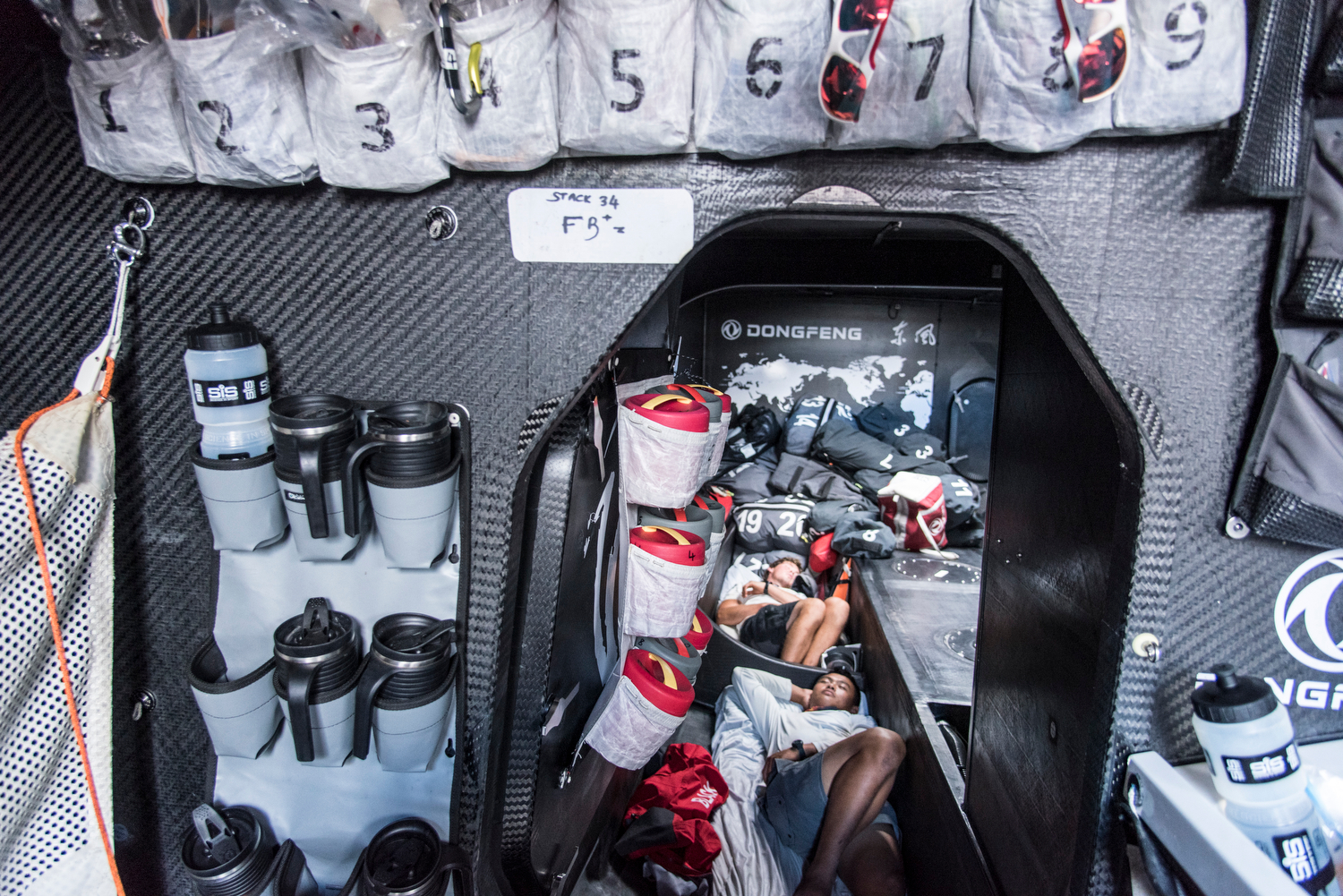 Durante la etapa 3 entre Abu Dhabi y Sanya (China), de 8.648 kilómetros, los tripulantes del Dongfeng Race Team intentan dormir. Cuando el viento es flojo, toda la carga se desplaza hacia la proa para intentar que el barco vaya más rápido. Lo mismo ocurre con la tripulación, que deja sus estrechas literas de popa para dormir en la parte delantera del barco.