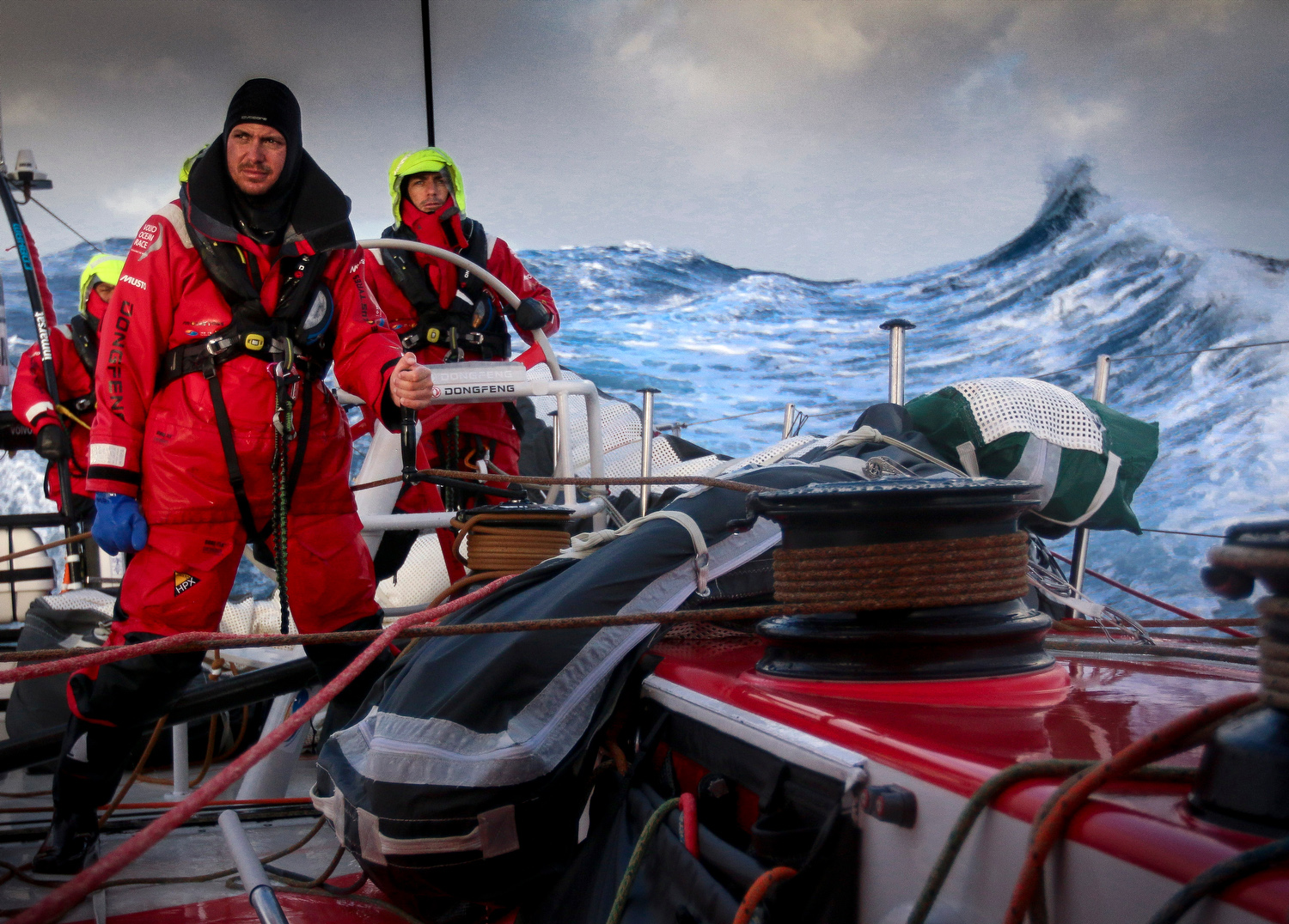 Una ola amenaza por la retaguardia a Dongfeng Race Team mientras navega en pleno océano Antártico, el más peligroso del mundo. Las temperaturas bajan de cero tanto fuera como dentro del barco. Lo atravesaron durante la etapa 5 entre Auckland (Nueva Zelanda) e Itajaí (Brasil), de 9.278 kilómetros.