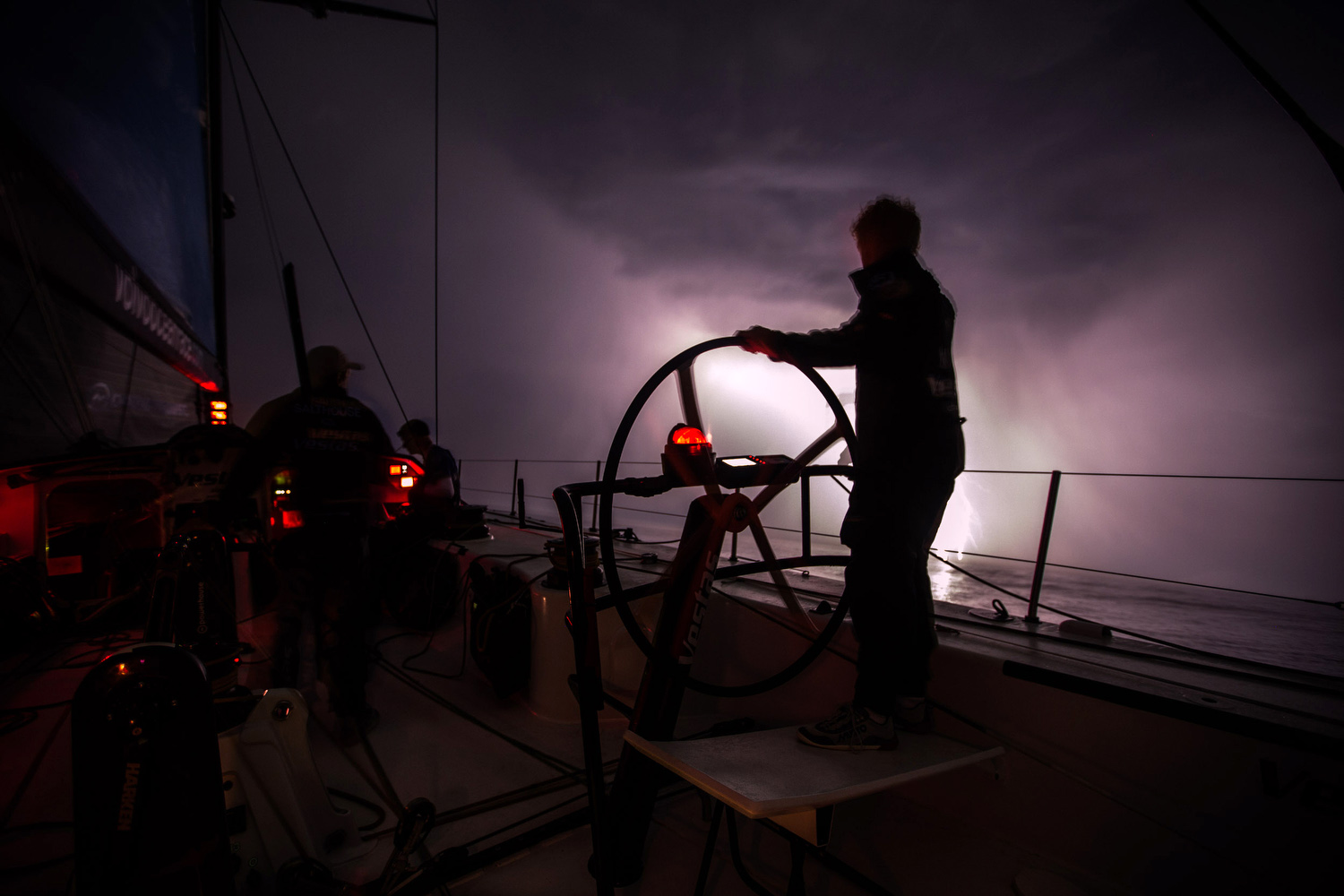Team Vestas Wind intenta rodear una tormenta eléctrica en pleno Golfo de Vizcaya, durante la etapa 8 entre Lisboa (Portugal) y Lorient (Francia), de 1.198 kilómetros. El equipo de bandera danesa volvía al agua tras reparar su barco embarrancado en la etapa 2.