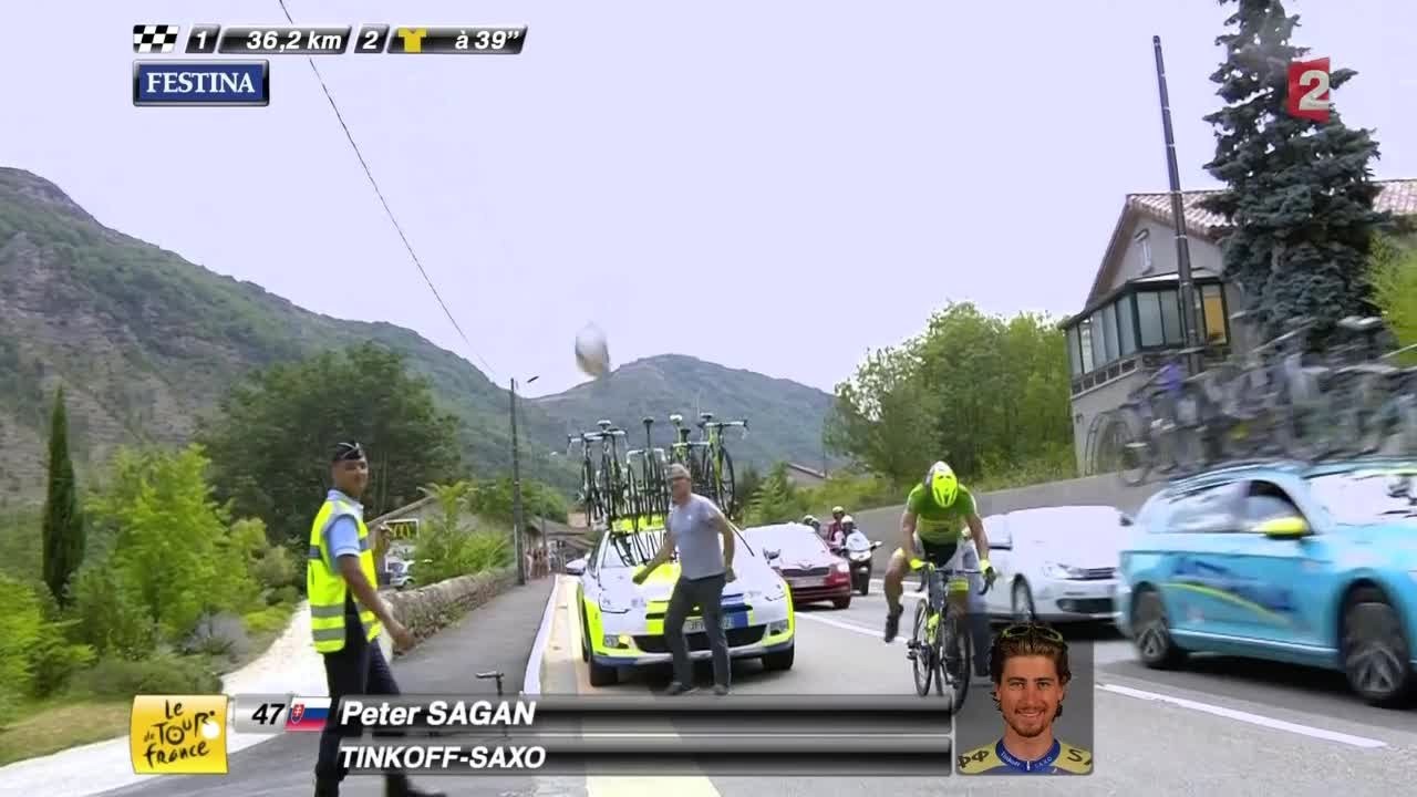 Faustino Muñoz, mecánico del Tinkoff Saxo, lanzó un bidón de agua a una moto de televisión que pasó muy cerca de Peter Sagan mientras éste cambiaba de bicicleta.