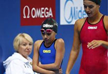 Alzain Tareq, de 10 años, terminó última en su carrera de 50 metros mariposa pero luego estuvo 35 minutos atendiendo a la prensa.