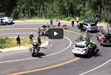 En una curva cerrada, tres ciclistas sufren un espeluznante accidente al chocarse contra un coche y una moto.