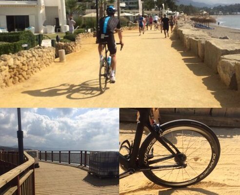 Hay ciclistas como el irlandés Nicolas Roche, del conjunto Sky, que se ha quejado, poniendo una imagen de su rueda clavada en la arena. Y es que la primera etapa, una crono por equipos con salida en Puerto Banús, no convence. Sale desde el Paseo Marítimo y pisa arena, algo que no está gustando en el seno del pelotón.