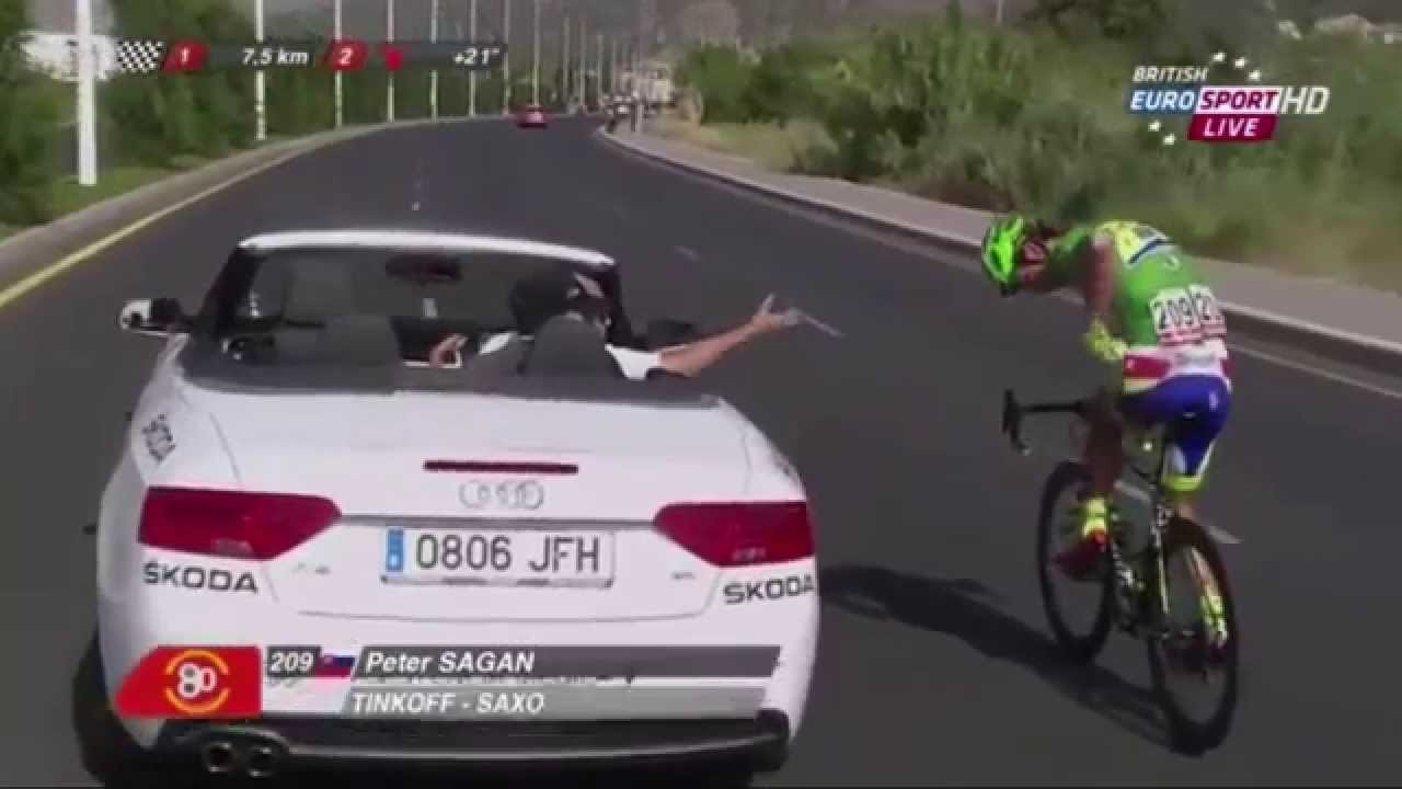 El monumental enfado de Peter Sagan tras ser arrollado por una moto de la organización