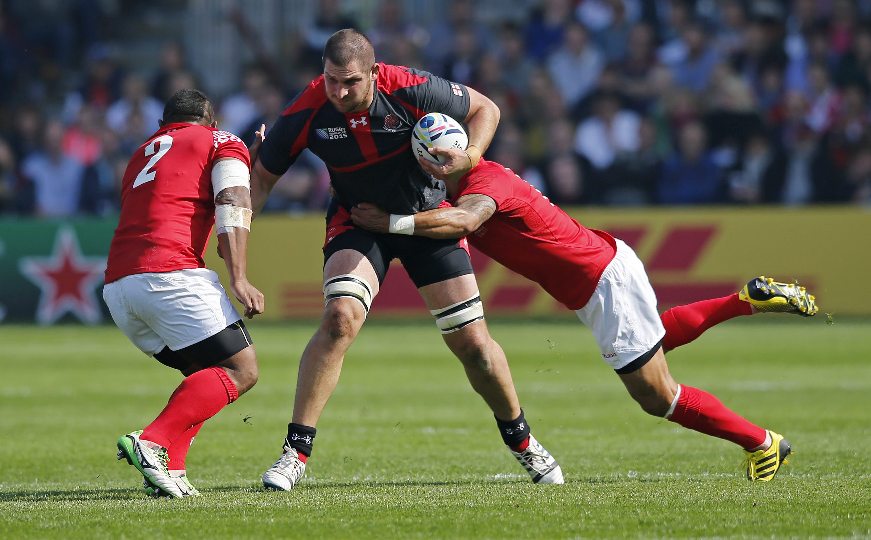 El georgiano Konstantin Mikautadze se intenta zafar de dos jugadores de Tonga
