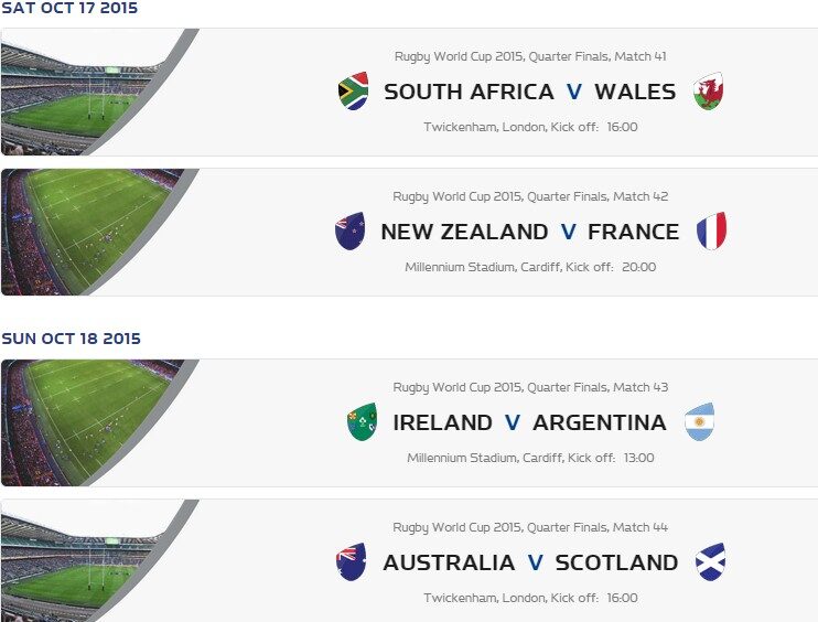 Estos 8 contendientes son Argentina, Australia, Escocia, Francia, Irlanda, Nueva Zelanda, País de Gales y Sudáfrica. Cuatro del Hemisferio Norte y cuatro del Sur. La lucha está servida en unos cuartos de final que se repartirán entre Londres-Twickenham y Cardiff-Millenium Stadium.