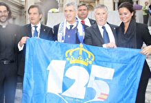 Villar, junto al presidente del Recreativo y una bandera del conjunto onubense | Twitter