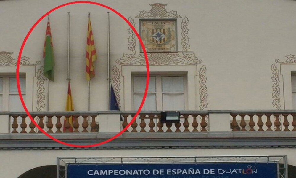 La localidad barcelonesa de Cerdanyola del Vallès acogió este fin de semana el campeonato de España de duatlón y la bandera española, situada en el balcón que se encontraba justo detrás del podio, lucía junto con la de la Unión Europea a media asta; mientras que la de Cataluña y la del municipio en cuestión, se izaban en la posición correcta.